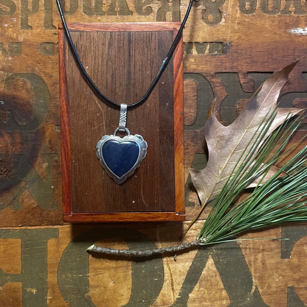 Lapis Lazuli heart stone set in sterling silver on 16” leather chain.