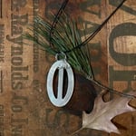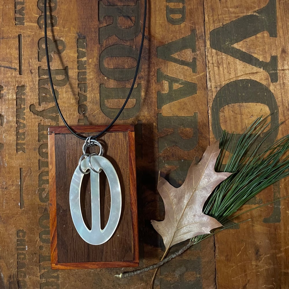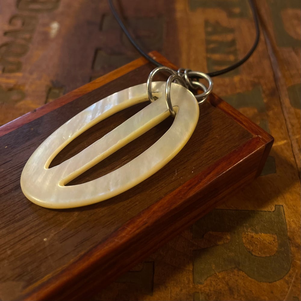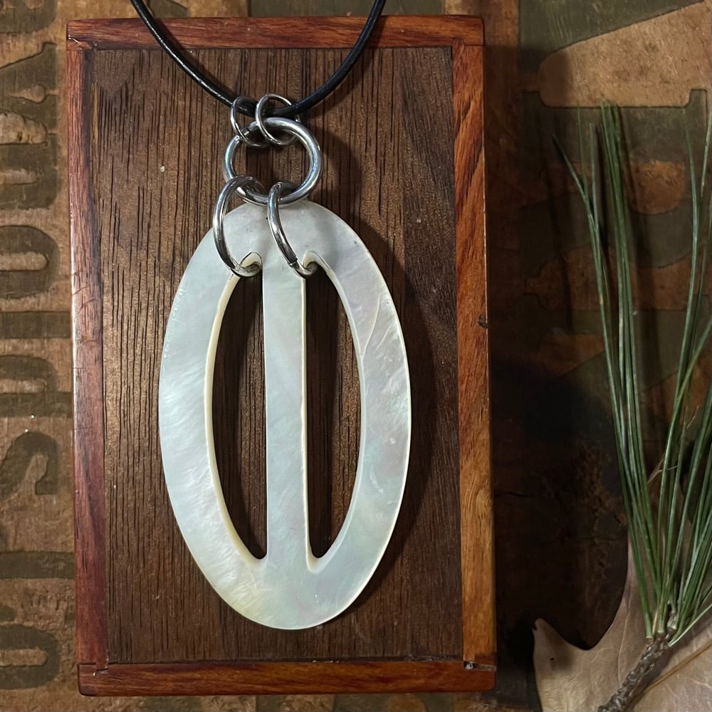 Antique Mother of Pearl shoe buckle hung by Sterling Silver jump rings on a leather cord