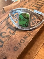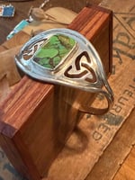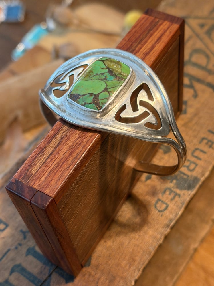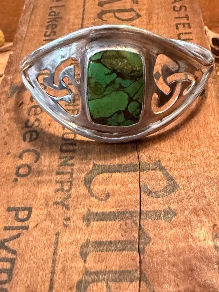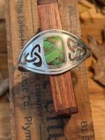 A beautiful green turquoise stone set in a Celtic inspired wide sterling silver bracelet.