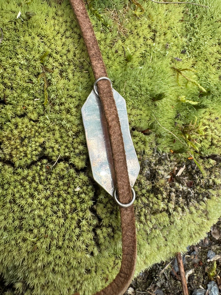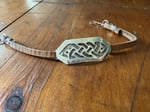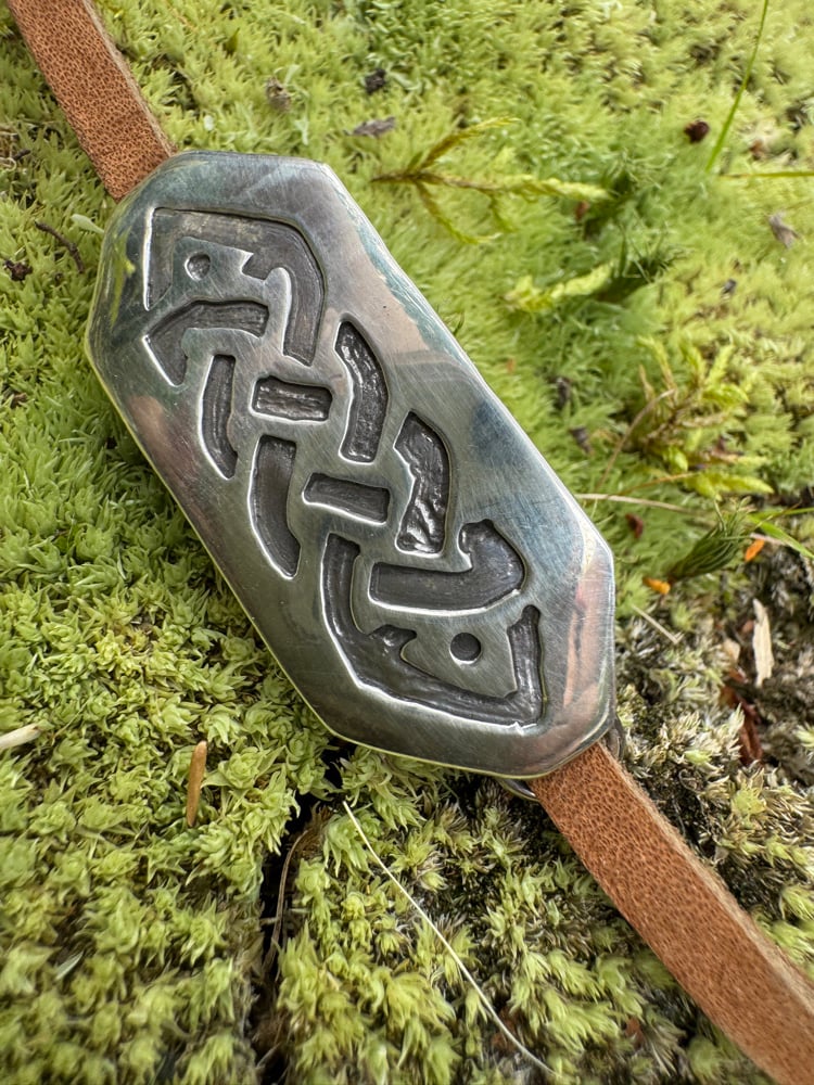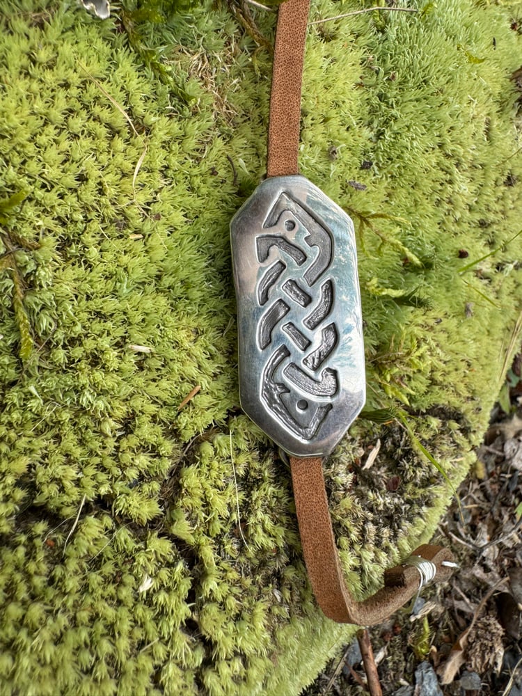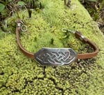 Hand cut Celtic design in Sterling Silver on a leather bracelet