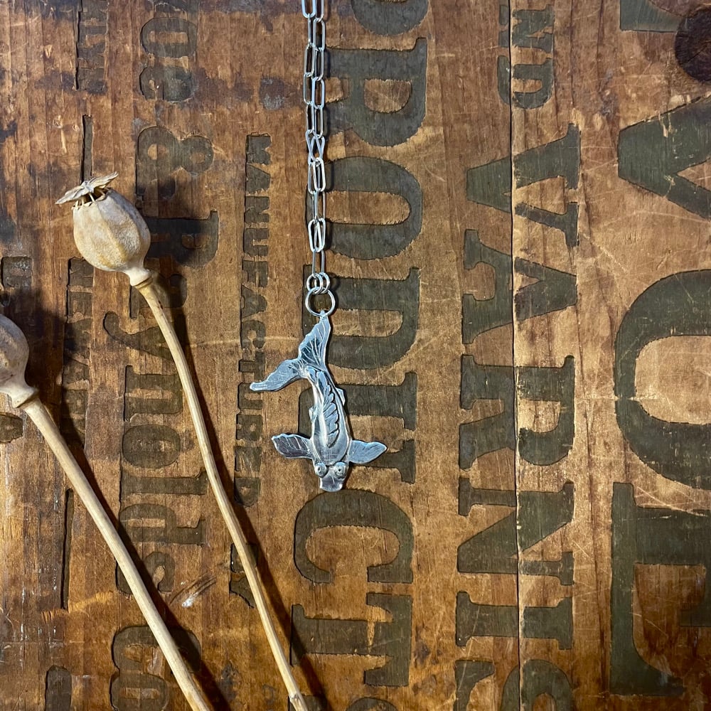 Carved and soldered sterling silver fish on 17” of sterling silver chain