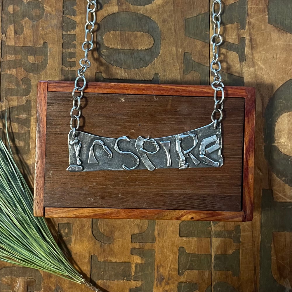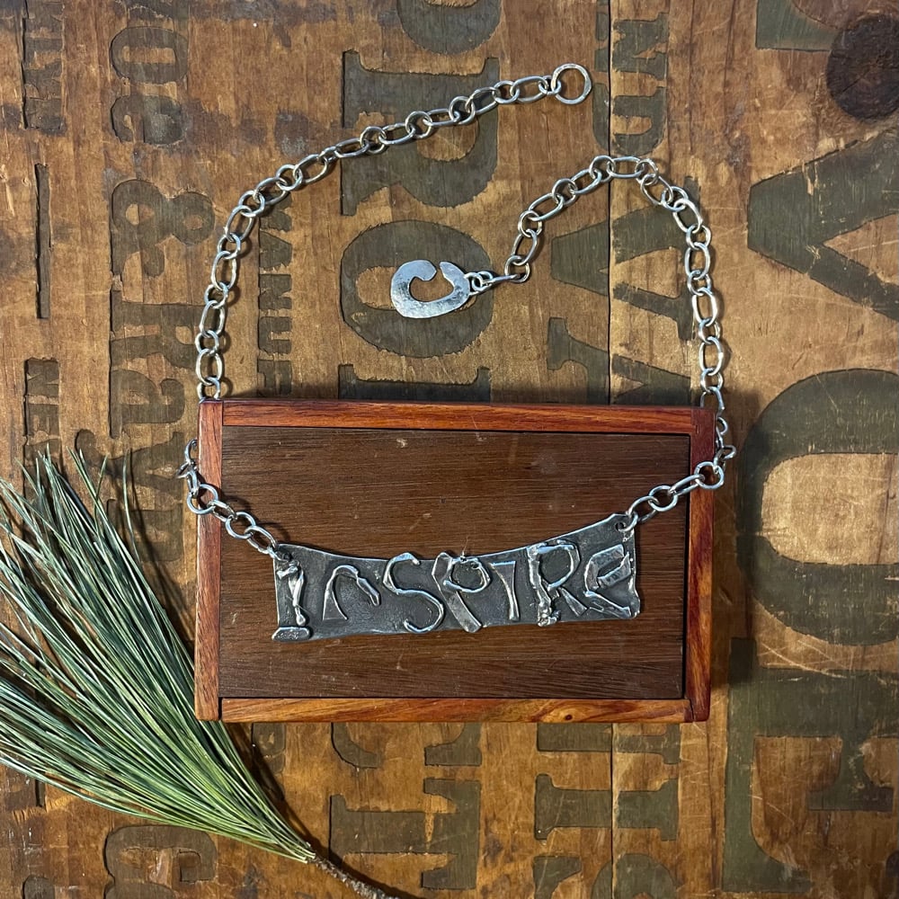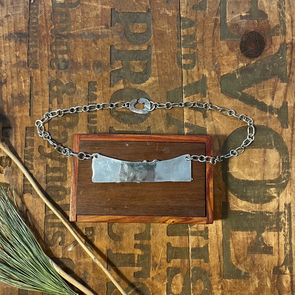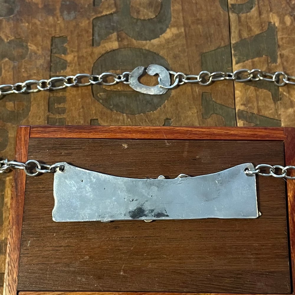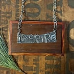 Sterling silver fused, bits and pieces, handmade chain and clasp. Fit is 15 1/2 inches round and the word plate is just under 3 inches.