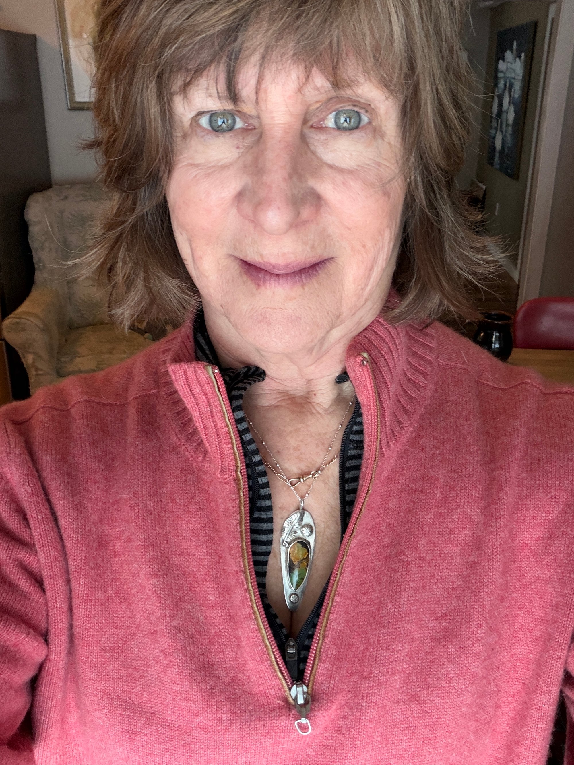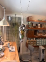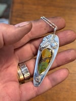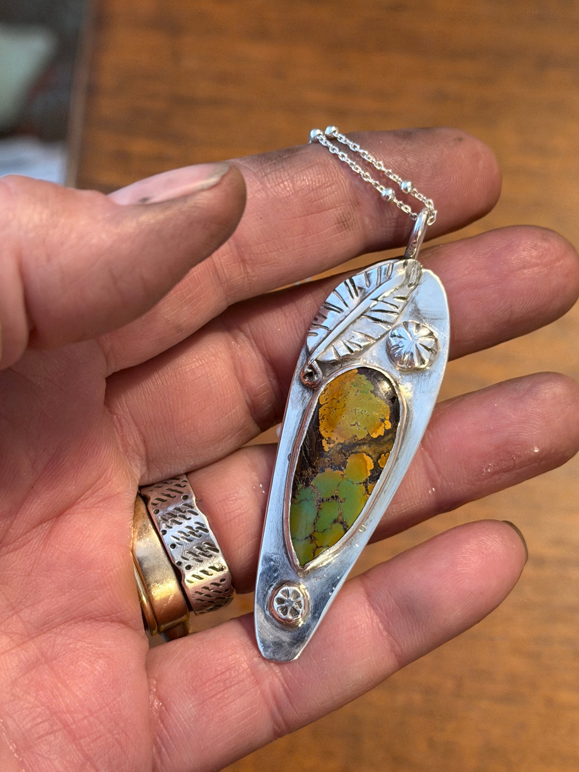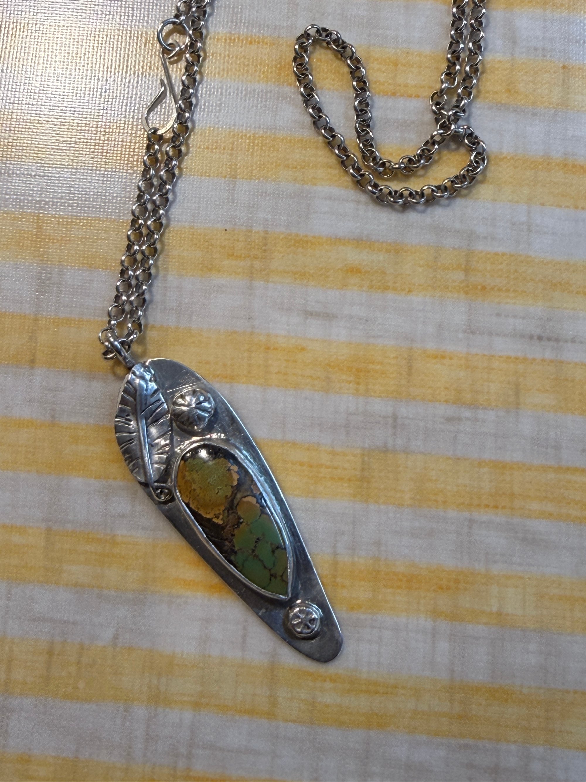 Sterling silver, Venus shape, with sterling silver leaf and flower buttons on it. Set with a beautiful piece of natural hubei turquoise, greens, gold and browns with natural flaws in it. Kind of like us all. Option to have the skinny beaded chain or the heavier style at different pricing.