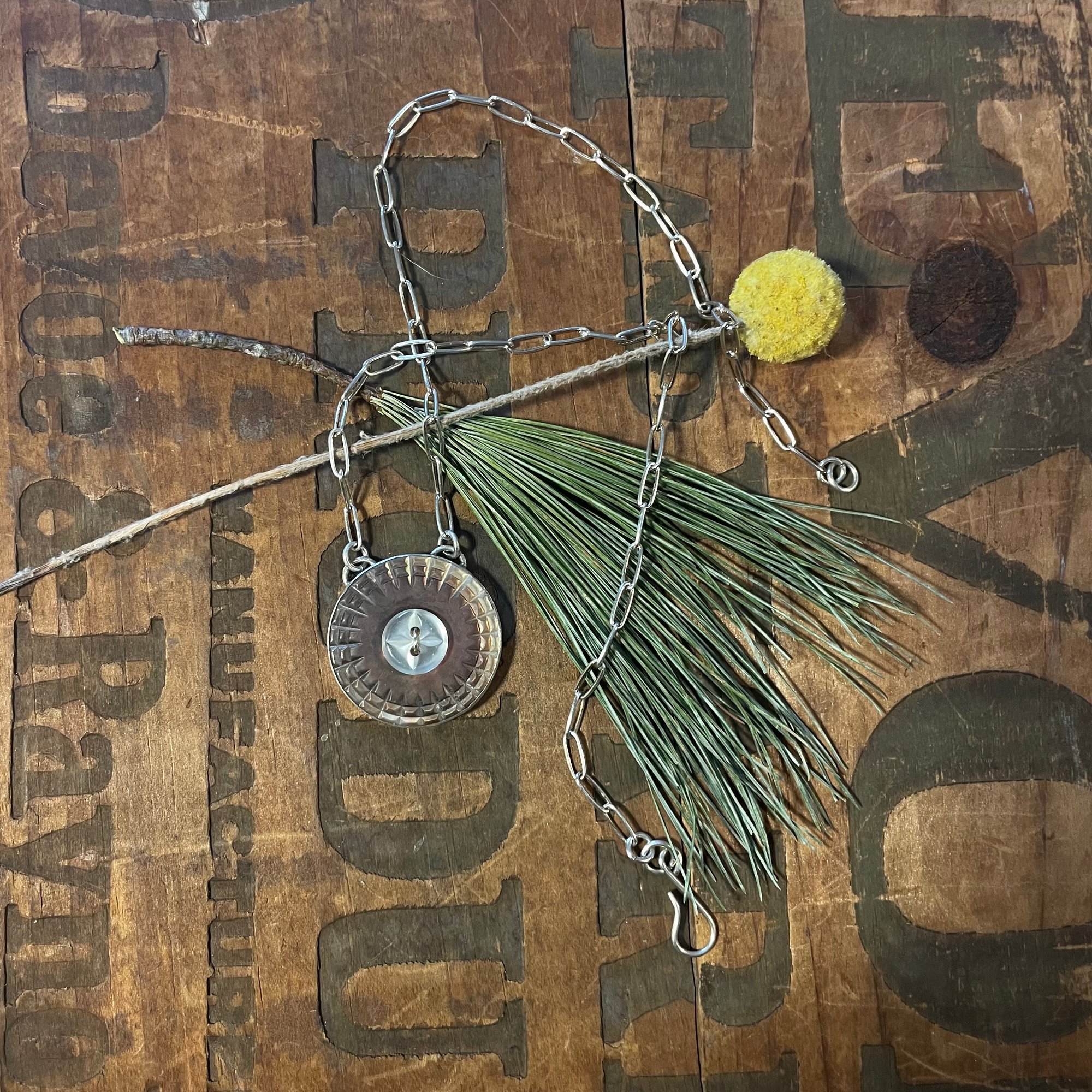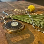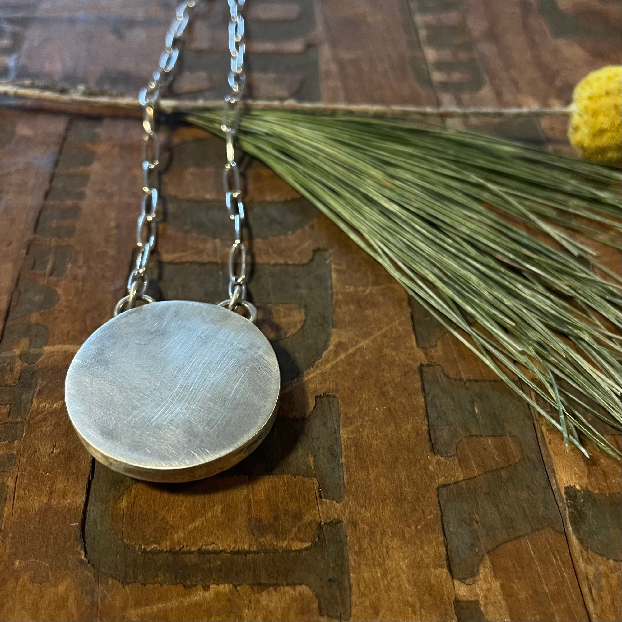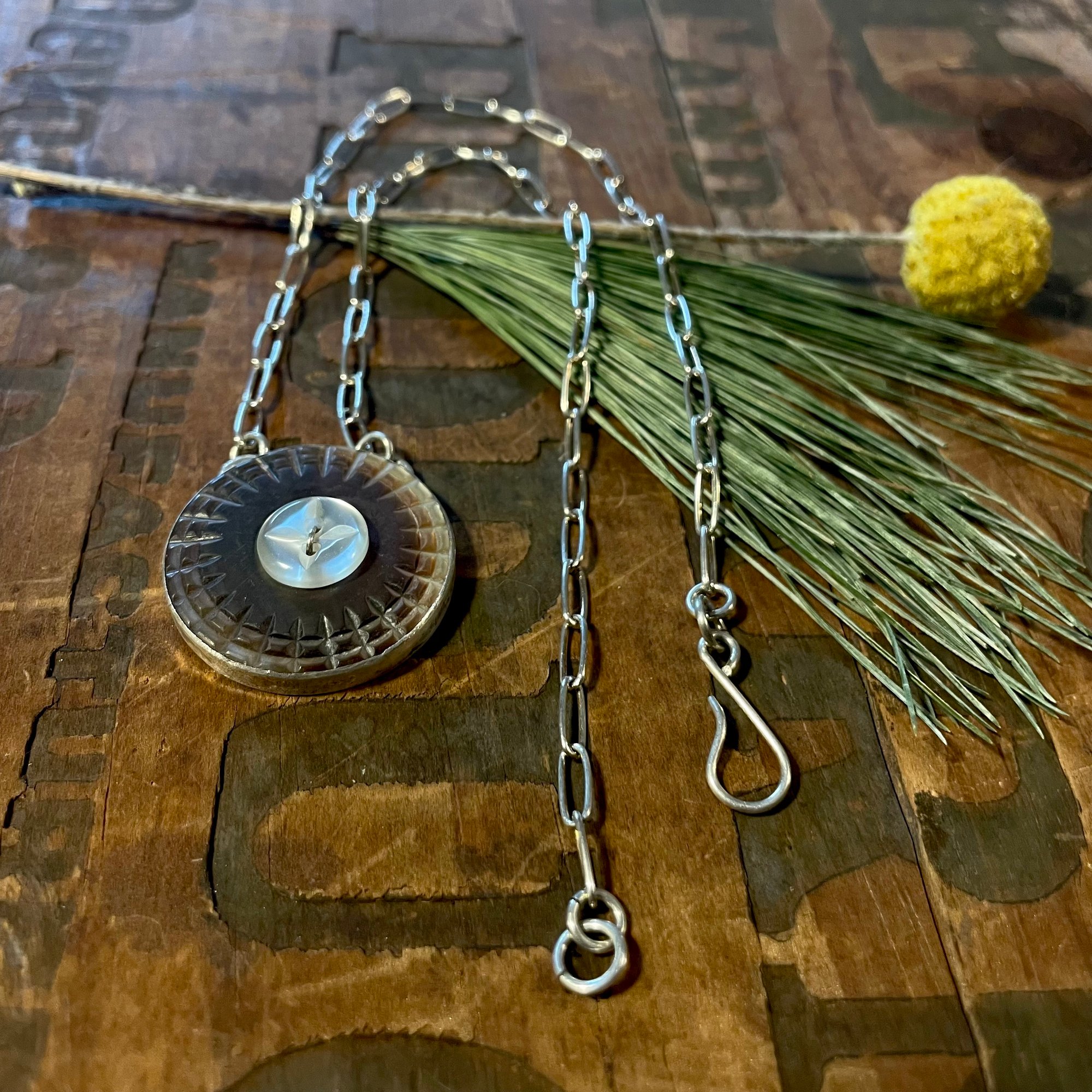 Two Mother of Pearl antique buttons set in sterling silver bezel set. Sterling silver paper clip chain and clasp.