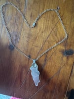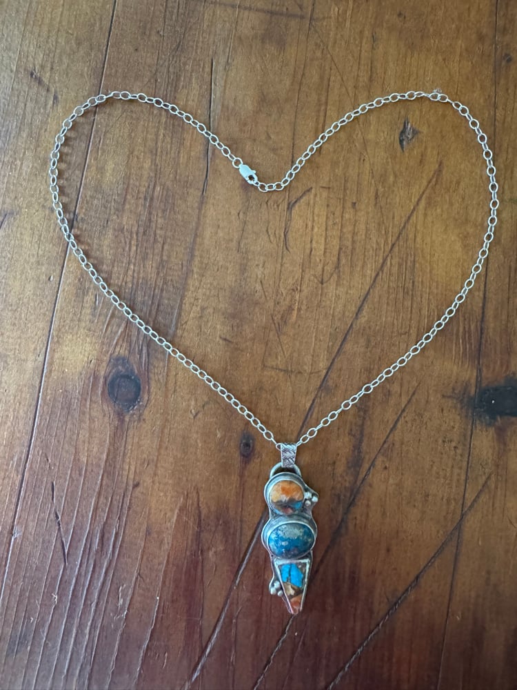 Three turquoise and Spiney Oyster stones set in Sterling silver on a fine Sterling Silver chain. Each stone is a portal to another world. 18 inch chain
