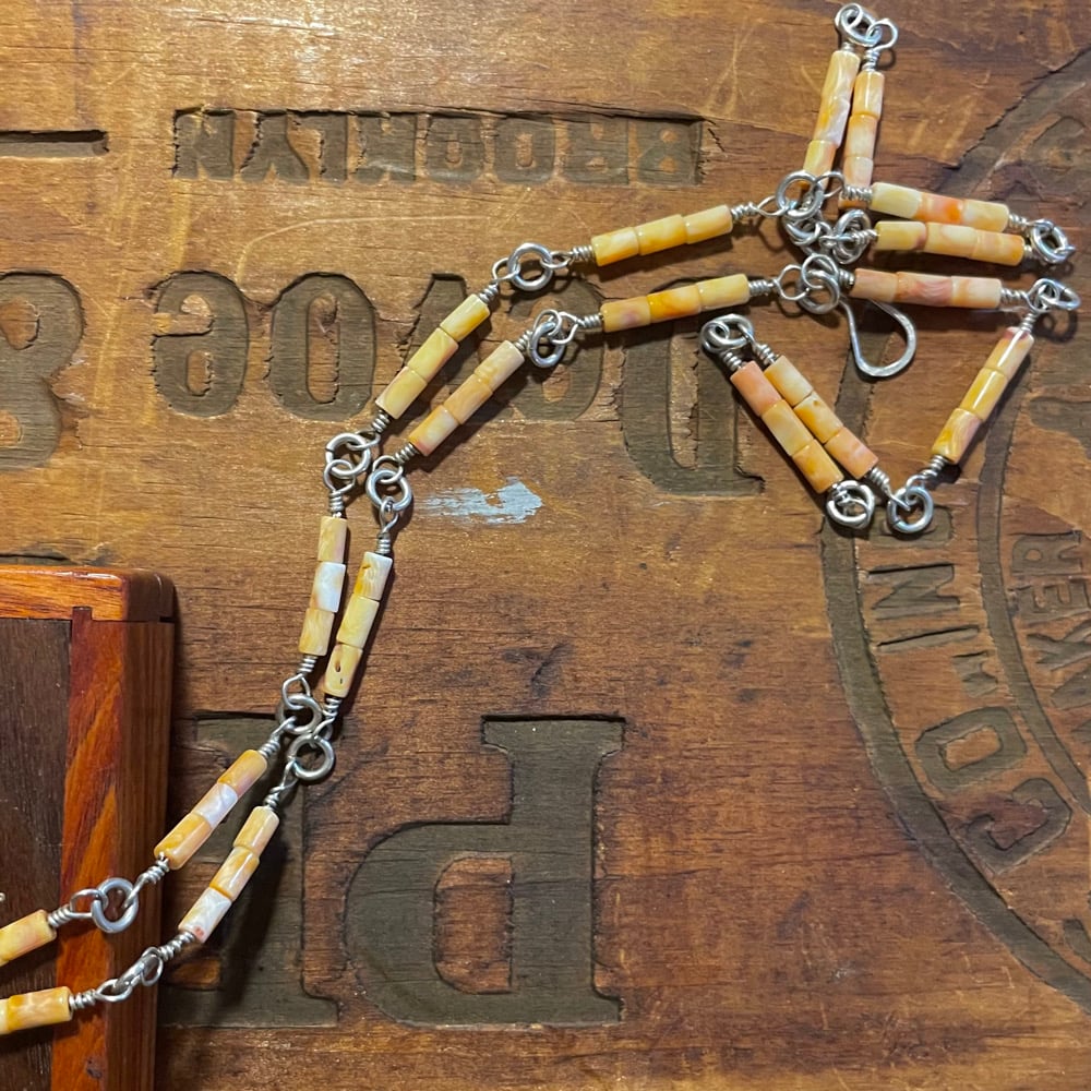 Spiney oyster and agate stone set in silver. Chain is spiney oyster beads.