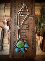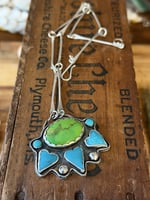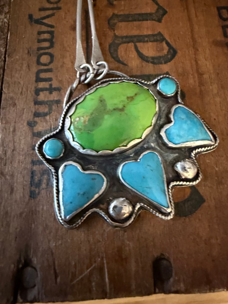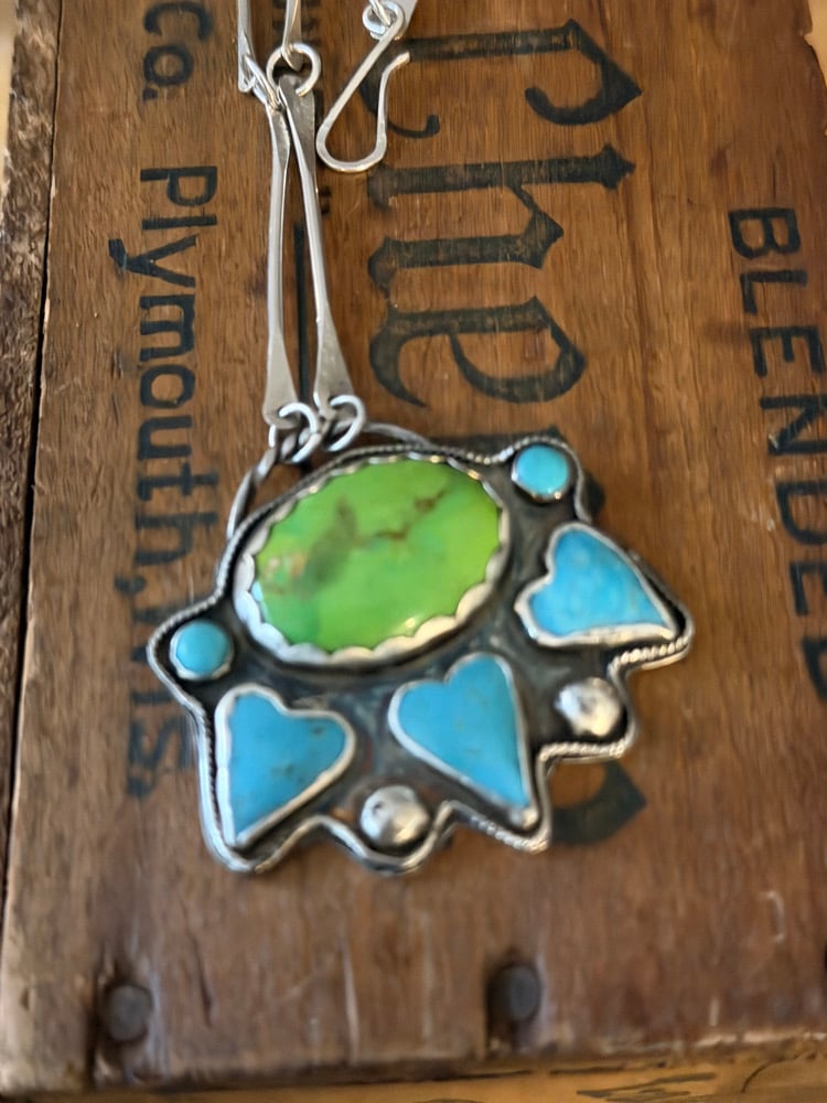 Statements are made to wow. This sterling silver, Turquoise and dyed green turquoise. Handmade bar chain. One of a kind.