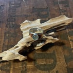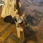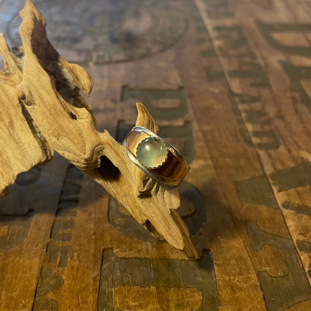 Translucent blue green chalcedony set on top of copper and sterling silver layered band
